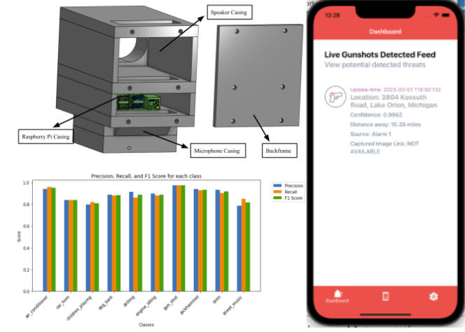 A 3D-printed, Raspberry Pi 4-powered IoT module, this Gunshot Detection Alarm is engineered for real-time audio surveillance, integrating a low-cost MEMS microphone, onboard preprocessing, and a Convolutional Recurrent Neural Network (CRNN) pipeline. Audio streams are captured in rolling windows, transformed into mel spectrograms, and passed through CNN layers for spectral feature extraction followed by RNN units for temporal context modeling. Furthermore, this device leverages Inverse Frequency Weighting to mitigate class imbalance in sparse gunshot datasets and applies data augmentation strategies such as random cropping and time-shifting.The case includes a combination of TPU + PLA filament, and contains isolated chambers for the Raspberry Pi 4, the USB microphone, and the USB speaker. Finally, detected gunshots are paired with mobile endpoints via a React Native interface, with local authorities and individuals notified through Twilio SMS messages. With a $300 build budget, this project achieved up to 95% classification accuracy.Full source code and implementation details are available on Github: https://github.com/khoslamanav25/GunshotDetectionAlarmA live demonstration of the system in operation can be viewed here: https://youtube.com/shorts/2qr7kStExkM?si=VYyx8P9yHGdpnPtJ