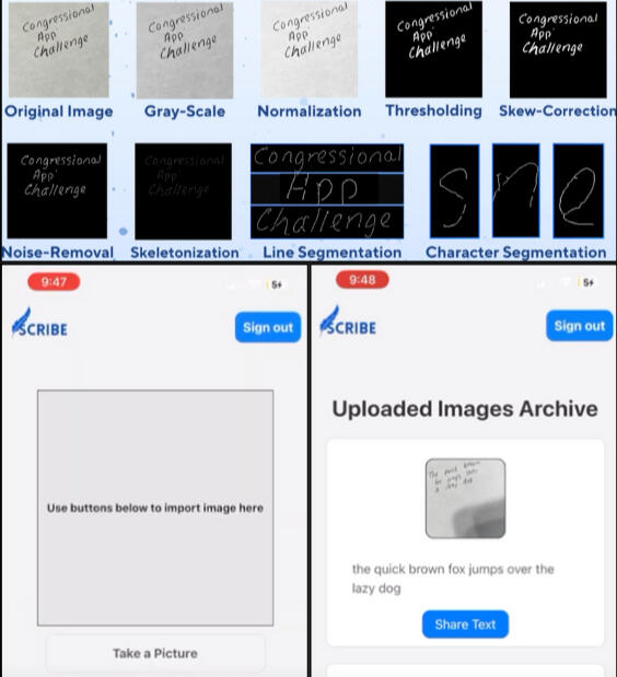 Scribe is a full-stack OCR React Native mobile application, designed to digitize noisy handwritten inputs through a multi-stage preprocessing and deep learning framework. First, OpenCV and scikit-image is utilized to apply eight sequential image normalization stages: grayscale conversion, adaptive thresholding, skew correction, dilation/erosion, segmentation, and contour analysis. Once preprocessed, images are passed into a CNN implemented in TensorFlow and trained on the EMNIST-Balanced dataset, which contains 131,000+ labeled samples across 47 classes. Stratified sampling techniques and input upscaling were used to mitigate class imbalance, yielding transcription accuracies exceeding 91.5% on unseen handwritten text.This model is fully integrated into a React Native application. Authentication and data records are handled via Google Firebase Authentication and Firestore DB/Storage, enabling users to log in, upload handwritten notes, and retrieve transcribed outputs across devices.A live demonstration of the system in operation can be viewed here: https://youtu.be/AYRvUX19s1k?si=r-zM6hD3Xsw-fU9l