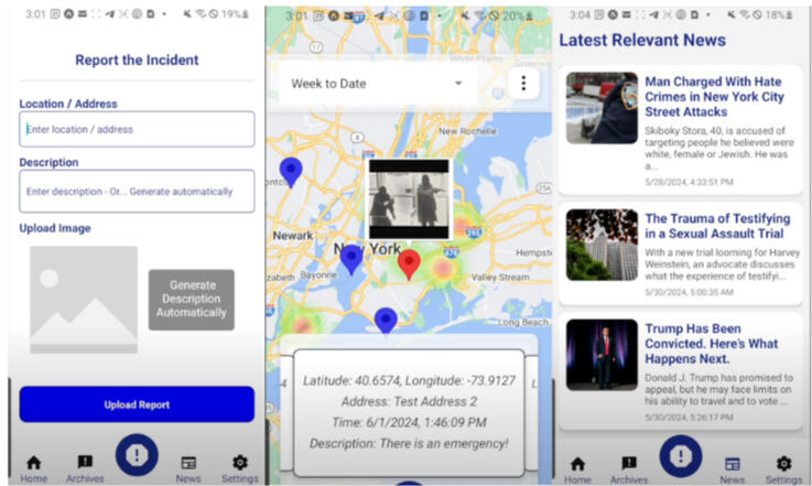 SafeStreets is a cross-platform mobile application built with React Native, designed to provide real-time crime awareness through a dynamic heat map, live reporting, and data integration. The system leverages Selenium to web scrape NYPD CompStat datasets to process official crime statistics, visualized via the Google Maps API as an interactive heat map with time-based filtering (24 hours, 1 week, 1 month, etc.). The app also integrates the NYTimes API, allowing a dedicated news feed to showcase dangerous events in the area around users. Google Firebase also manages user authentication and the Google Firestore database process image, caption, and all other user data.Furthermore, SafeStreets incorporates a live crime reporting pipeline where users can upload images of incidents. These are processed through a CLIPxGPT image-captioning model tuned on the FLickr30k dataset, generating captions that contextualize visual evidence. Each report is geotagged and displayed on the heat map, and when a high-threat event is dedicated, nearby users and local law enforcement are alerted, with corresponding location metadata attached.Full source code and implementation details are available on Github: https://github.com/khoslamanav25/SafeStreetsBronxNYA live demonstration of the system in operation can be viewed here: https://youtu.be/zTUIvT2SCo8?si=k4htoRjbJAnEjWlq